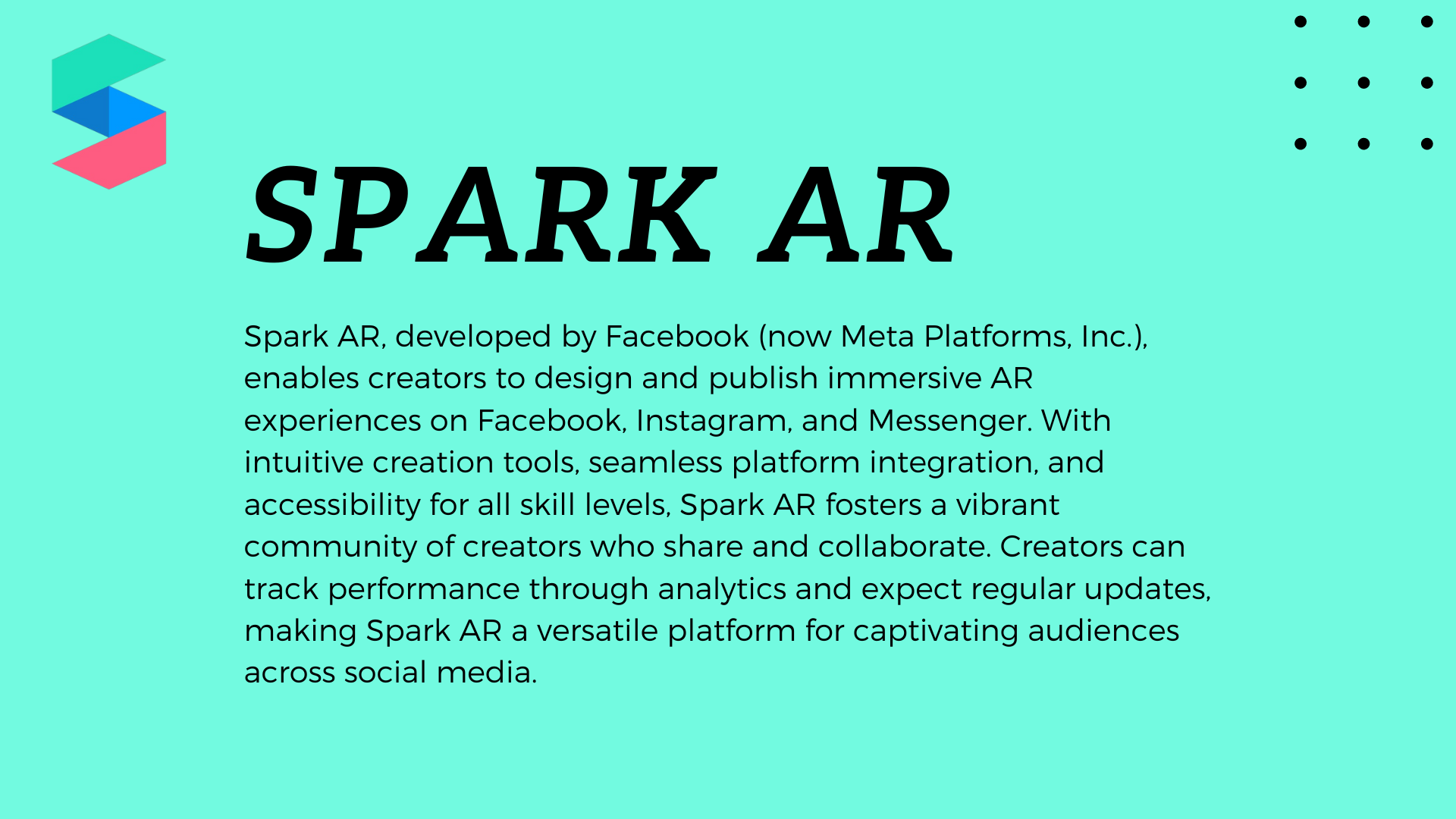 Spark AR, developed by Meta Platforms, Inc., empowers creators with intuitive tools for designing and distributing AR filters on Instagram and Facebook. With seamless integration, accessibility, community collaboration, analytics, and regular updates, Spark AR revolutionizes AR filter creation and distribution, offering endless creative possibilities.