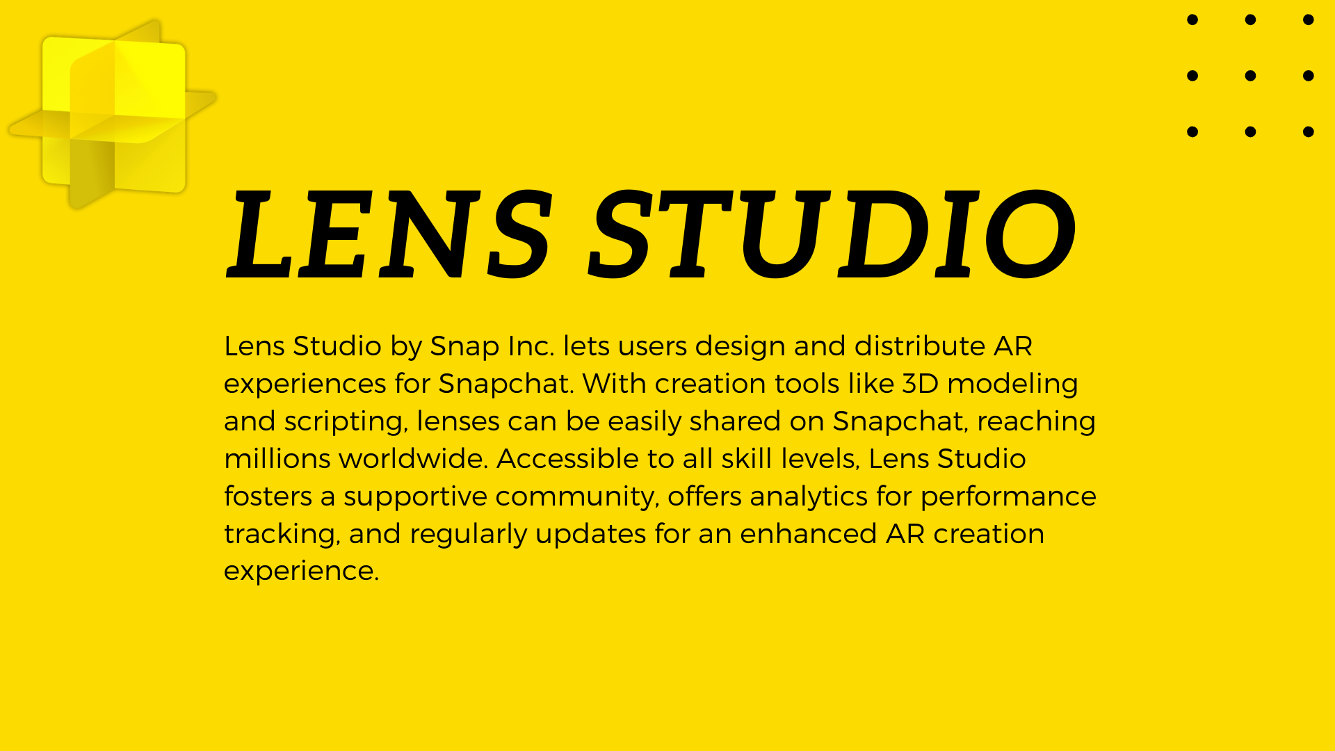Snapchat lenses are dynamic AR effects users apply to photos and videos. Created with Lens Studio, they include face, world, and marker-based lenses.